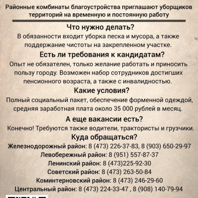 Комбинатам благоустройства срочно требуются работники ручной уборки. Устроиться можно как на временную, так и на постоянную работу